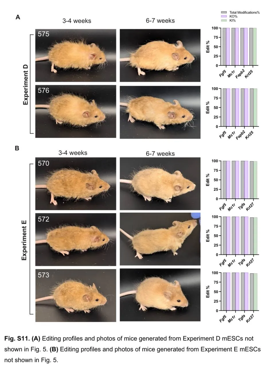 Редактирование mESCs с CRISPR/Cas9 — модифицированные клетки вкладывали в 8-клеточные эмбрионы. Получили 7 мышей с редактированием 98-100% для каждого целевого участка.