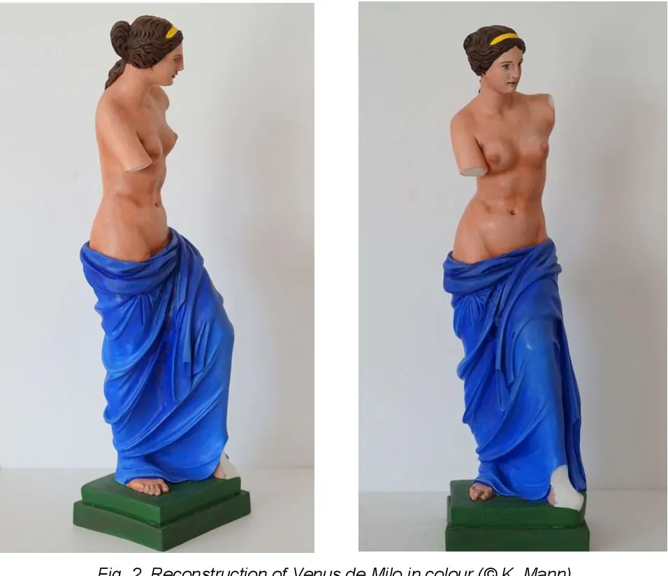Венера Милосская у нас на третьей фотографии, только не цветная и без рук. Вполне вероятно, она выглядела примерно как на четвёртой (работа вот). Грудь, кстати, очень симметрична, то есть Венера очень иммунокомпетентна.