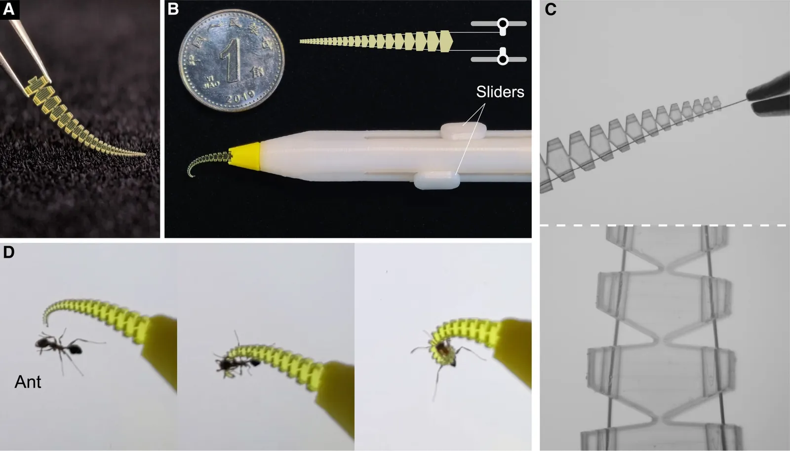 - Уменьшенный в 70 раз вариант длиной под сантиметр с диаметром кончика 0,14 мм. Сделан из смолы стереолитографической печатью. Использовался для безопасного захвата и манипуляций с муравьем без вот этого мема про полученную кашицу.