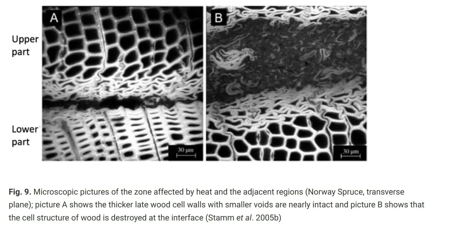 Есть ещё более интересный эффект. Дело в том, что дерево — это отчасти полимер. В нём лигнин. А как и любой полимер, он отлично плавится! Точнее, переходит в вязкотекучее состояние, как любой нормальный аморфный полимер, до самого плавления не доходит.