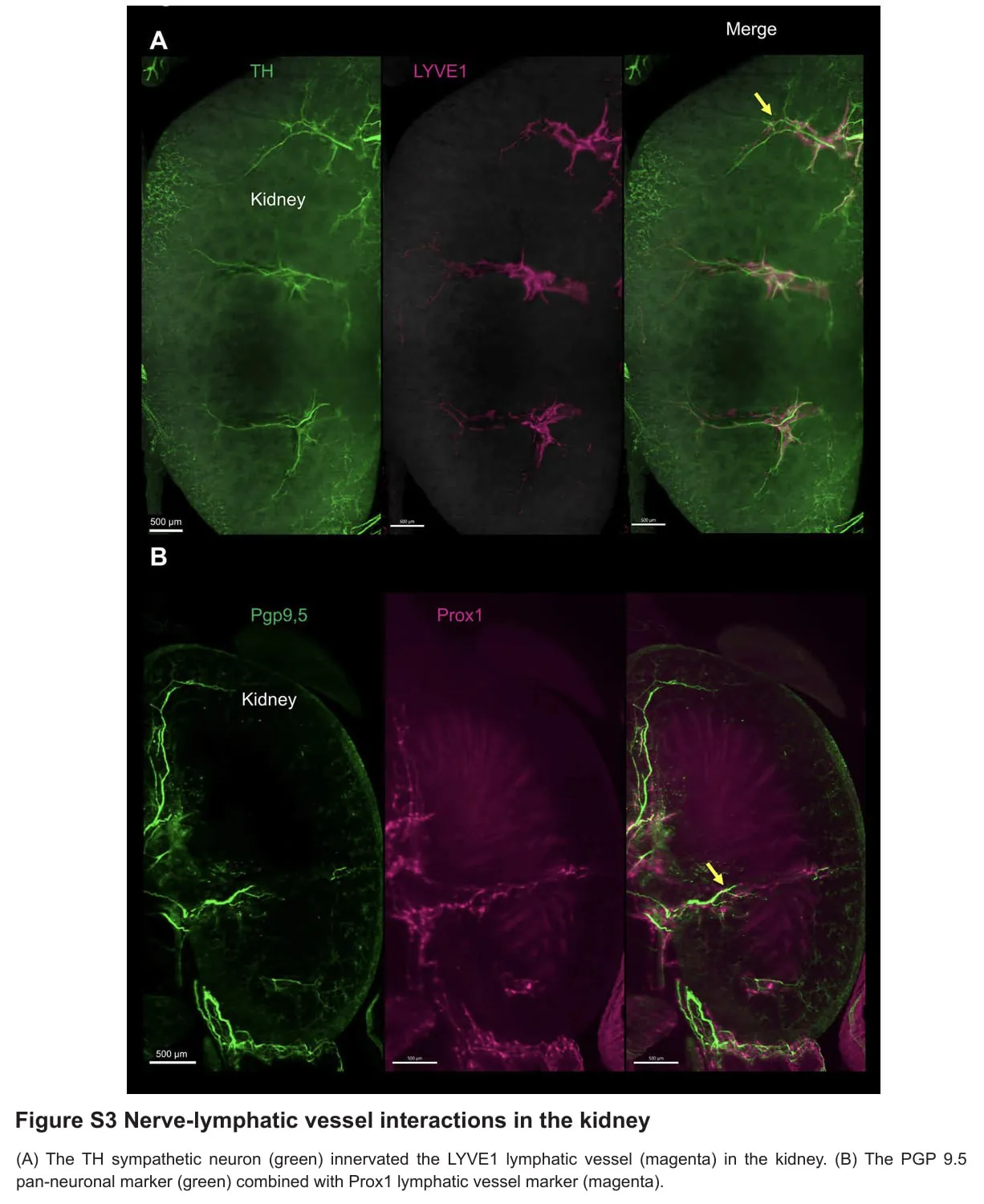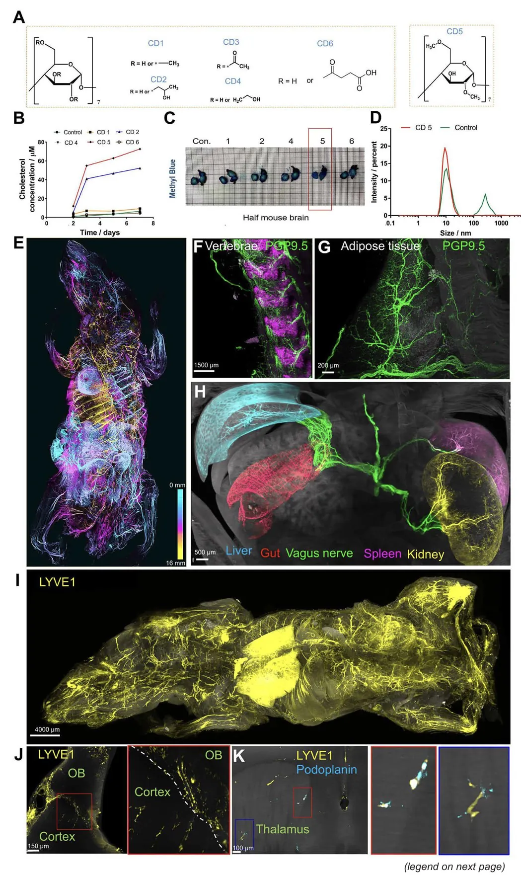 — А так ещё полностью картировали периферическую нервную систему, показав, как нервы проникают во все ткани, включая жировую ткань и позвонки. Смогли проследить путь блуждающего нерва к печени, селезенке и кишечнику. — Создали первую полную 3D-карту всех лимфатических сосудов. Обнаружили лимфатические сосуды, входящие непосредственно в ткань мозга (паренхиму). Раньше думали, что в самой ткани мозга их нет. — Нанесли на карту расположение иммунных клеток по всему телу. Увидели, что иммунные клетки (CD45) скапливаются вдоль нервных волокон, особенно в кишечнике. Это доказательство, что нервная и иммунная системы обмениваются данными. — Сравнили обычных мышей и стерильных мышей, у которых нет микробов в кишечнике. Оказалось, что у стерильных мышей нервная сеть в стенке кишечника (миэнтериальное сплетение) была гораздо менее плотной и дезорганизованной.