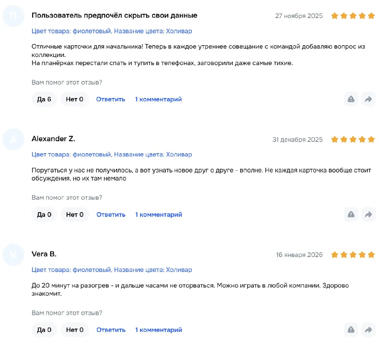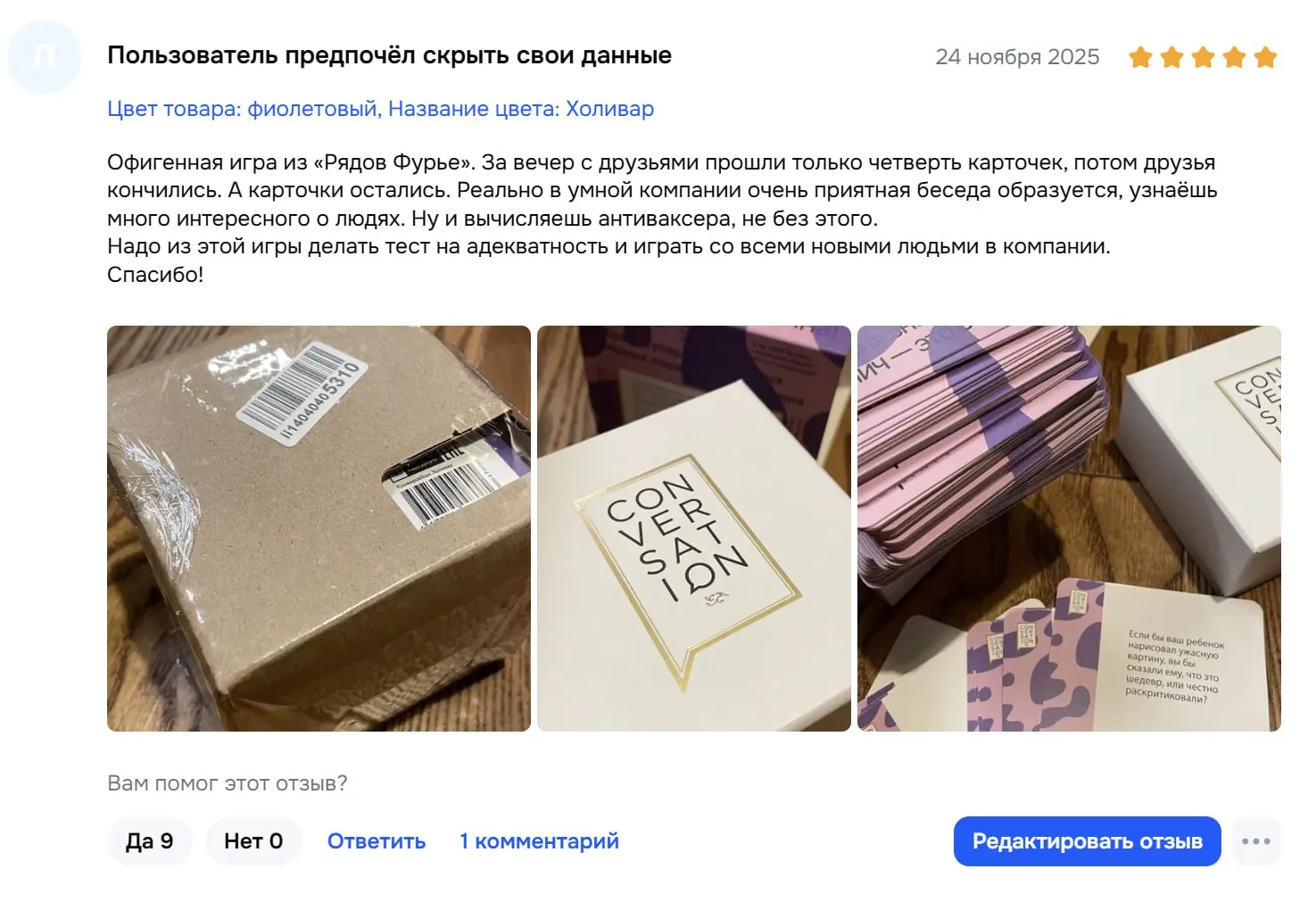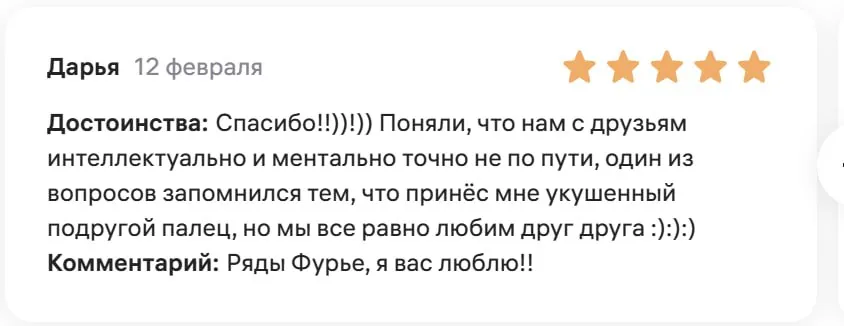 Мы тут затестили вашу игру)) Играли четыре гуманитария. Не подрались даже близко, но несколько раз почти поплакали. Играли раньше в подобные игры с вопросами, но там была проблема, что много карточек скипали, и в итоге проходили всё за час. А тут мы растянули на час вопросов 10-15 всего. Всем очень зашло, в общем — игра прям милая, спасибо!