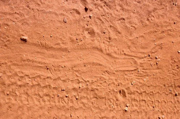 Выглядит как почти метровая бороздка на окаменелом песке. Следы лапок не видать — их подтёрло логичным продолжением дамана. Зато есть окаменелый кругляшок по центру — тут не надо быть палеонтологом для опознания.